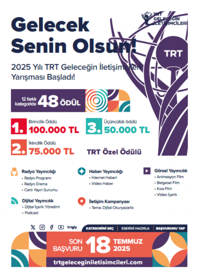 Türkiye Radyo Televizyon Kurumu olarak; ülkemizin eğitim, kültür ve sanat hayatı ile yayıncılık alanına destek olmak, kurumsal tecrübemizi gençlerle paylaşmak ve yarının yayıncıları olacak üniversite öğrencilerimizin iletişim alanındaki yeteneklerini sergilemelerine imkân sağlayarak gençleri teşvik etmek amacıyla düzenlediğimiz TRT Geleceğin İletişimcileri Yarışması'nın bu yıl on birincisini gerçekleştiriyor.